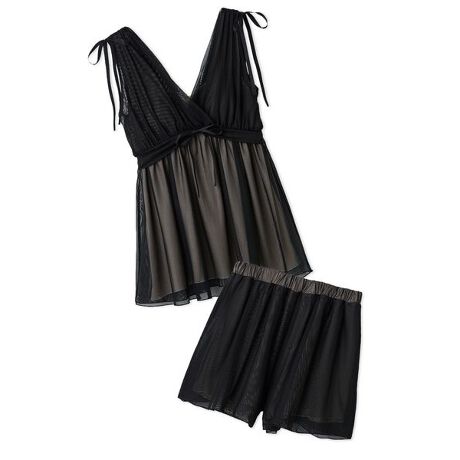 肩にあしらったクラシカルなリボンが揺れる、チュールをふんだんに使用したナイトブラ付きのチュニックとショートパンツのセットアップです。