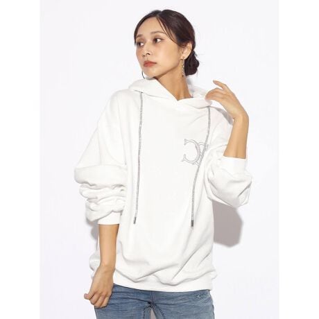 キラキラと輝くビジューのスピンドルが存在感を放つ裏毛フーディー。