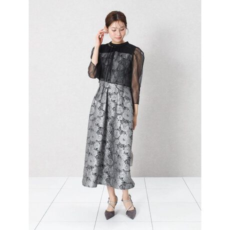 黒チュールトップスと花柄ワンピースを組み合わせた、オケージョンシーンに映えるドレス。