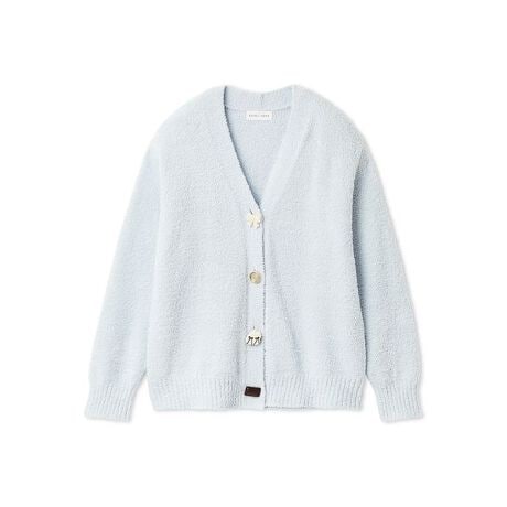 リボンケーキやチョコレートモチーフのボタンを付けた、Vネックのニットカーディガンです。