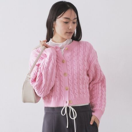 ・ざっくり感のある太ケーブル編み地がキャッチーなニットカーディガン。