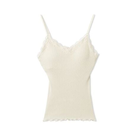 胸元にレースを配し、裾にメローを入れたフェミニンなディテールで、カーディガン等のインナーとしても便利。