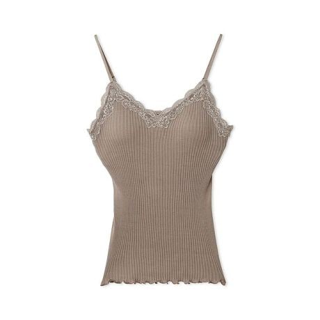 胸元にレースを配し、裾にメローを入れたフェミニンなディテールで、カーディガン等のインナーとしても便利。