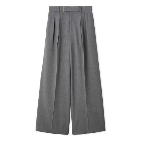 同素材を使用したダブルスリットシンプルジャケット(FWFJ261054)とセットアップ着用が可能で、パンツのウエストにはジャケットのメタルボタンと色をリンクさせたワニカンを付けてアクセントにしました。
