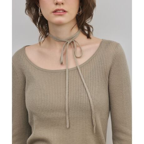 薄手ながら暖かみのあるウール混セミ梳毛(そもう)素材でお作りしたリブニットトップ。自然な光沢感や滑らかな肌触りが特徴で、素材の良さと上質感の両方を併せ持った一枚に仕上げています。 シンプルなデザインながら、女性らしさ感じるデコルテラインに首に付けた同素材の細いチョーカーがアクセント。チョーカーは首回りで二重に巻いて垂らしたり、リボンで結んだり、とってシンプルなトップスとして楽しんだりとアレンジも自在。キナリ、チャコールのベーシックカラーに加え、カーキは袖口にラベンダーの配色を取り入れて遊び心をひとさじプラスしました。コーディネートの主役にも脇役にもなれる万能トップスを、ぜひお見逃しなく。 同シリーズでお作りしたリリヤーンニットカーディガン【品番:0326153316】のご用意もございます。