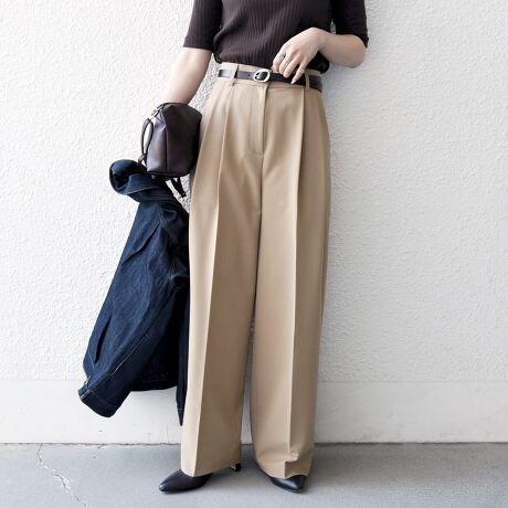 やや太めのベルト幅と2タックのワイドシルエットでマニッシュな印象のトラウザー。