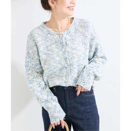 多色の糸を編み込んだ、表情豊かなミックスヤーンニットカーディガン。