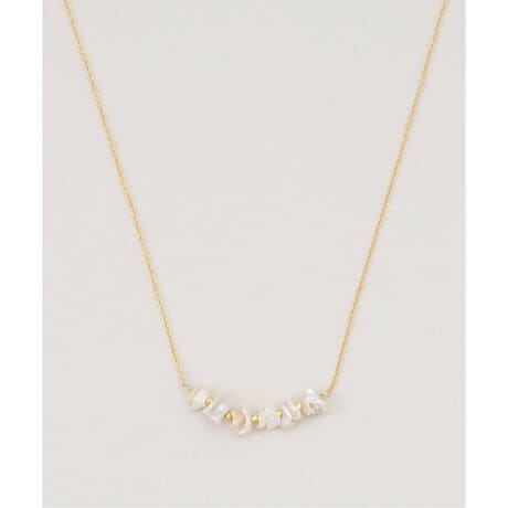 ゴールドチェーンと透明感のあるケシパールが相性良く、首元にポイントを。