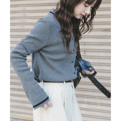 襟元と袖口に施されたバイカラーラインが、スタイリング全体をキリッと引き締める配色ポロニット。クラシックなポロシャツデザインをベースに、大人の女性にふさわしい上品な印象に仕上げました。身体のラインを真っ直ぐに、すっきりと見せてくれる細リブ編みを採用。縦のラインを強調し、自然な細見え効果を演出します。袖口に向かって緩やかに広がるフレアスリーブが、手元にさりげない女性らしさをプラス。フロントはボタン仕様のため、プルオーバーとしてはもちろん、軽い羽織りとしても着用可能です。きれいめからカジュアルまで幅広く活躍する、着回し力の高い一着です。