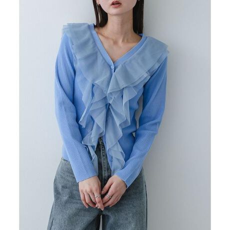 柔らかなリブニットに、繊細なチュールフリルを贅沢にあしらったカーディガン。透け感のある軽やかなフリル素材を採用することで、ニット特有の重さを感じさせないエアリーな表情を引き出しました。肩からフロントラインにかけてのチュールの分量を調整しているため、着膨れすることなくスマートな佇まいをキープ。一枚で着映えしつつも上品にまとまっており、休日のお出かけからオフィスカジュアルまで、幅広いシーンに彩りを添える一着です。
