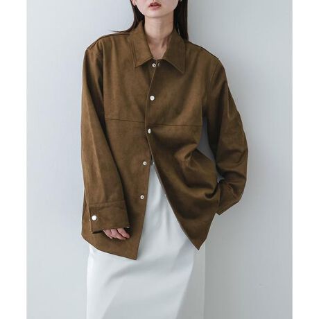 滑らかで高級感のあるスウェード調素材を使用したジャケット。ゆったりとしたオーバーサイズながら、落ち感のある素材によってすっきりと着こなせるのが魅力です。フロントや袖口にあしらわれたシルバーのメタルボタンが、シンプルなデザインにキリッとした表情をプラス。季節の変わり目の羽織りとしてはもちろん、ボタンを留めてシャツ感覚でも着回せる、洗練された大人カジュアルに最適な一枚です。