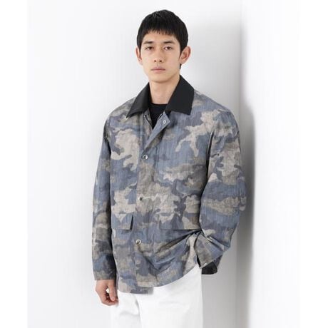 「WARP PRINT」という手法で、経糸のみにカモフラージュ柄をプリントした素材をライニングに採用したオーバーブルゾン。ブリティッシュな短丈カーコートをモチーフに、着丈が短めなオーバーブルゾンに仕上げました。