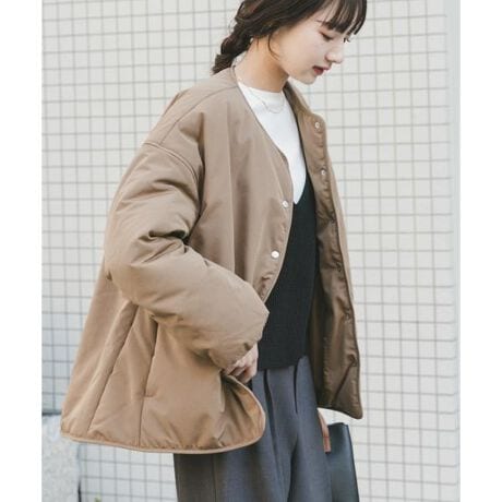 裾に向かって緩やかに広がるテントシルエットが魅力の中綿ブルゾン。前後差のある着丈でヒップまわりを自然にカバーし、横から見たボリューム感が女性らしい印象に。ノーカラー仕様でレイヤードしやすく、袖口のギャザーが丸みのあるシルエットを演出。軽さと暖かさを兼ね備え、季節の変わり目にも活躍します。