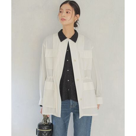 ■デザイン・フロントの大きめなポケットがアクセントになったオーバーサイズのジャケットは、小さな襟元にすることで端正でモダンな印象にし、どこか女性らしさを感じる1枚に仕上げています。・オーバーシルエットだからこそ、首や肩が美しく見える絶妙なサイズ感にこだわりました。・本来メンズライクでカジュアル、ハードな印象になりやすいミリタリーアウターを組曲流に解釈して大人仕様にアレンジしています。・ウエストはドローコード仕様で、合わせるボトムスに応じてシルエットのアレンジが楽しめます。・辛口なアイテムだからこそ、フェミニンで可愛らしいアイテムとの相性抜群です。