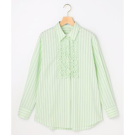 ■デザイン・春を連想させるパステルカラーのストライプに、フリルデザインを施したこの時期大活躍間違いなしのシャツ。・上着や、着合わせニットの中からチラッと覗く位置につけたフリルは、布端のピコミシンからそのボリュームまで細やかなディテールが光るデザインに仕上がりました。・ややオーバーサイズのシルエットは、ボーイッシュながらも女性らしさを感じさせるボリューム感にこだわりました。
