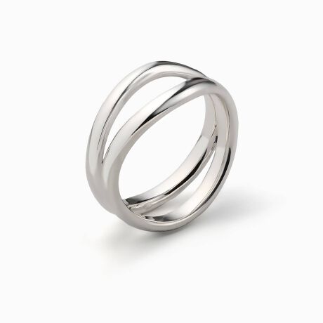 2連のリングが絶妙なバランスで交差することで、奥行きのある独特のシルエットを生み出し、見る角度によって様々な表情を見せ、唯一無二の存在感を放ちます。