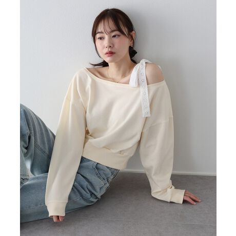 ラフさと女性らしさを兼ね備えたレースオフショルスウェットトップス