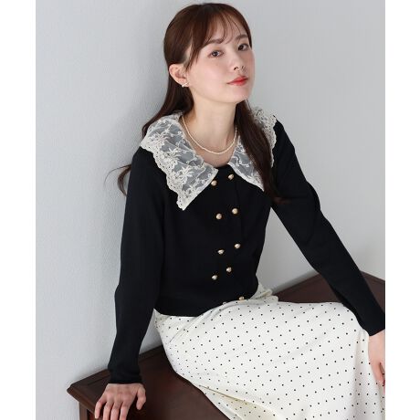大きなレースの襟をドッキングした、一枚でレイヤードスタイルが完成するフェミニンな魅力のニット。