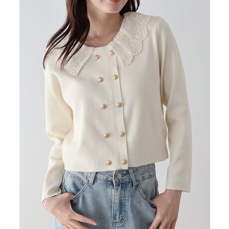 きちんと見え×フェミニンな金ボタンレース衿ドッキングニットカーディガン
