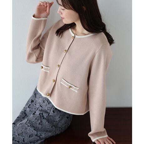 配色ラインのバイカラーデザインとフロントに並んだ金ボタンが、クラシカルな気品を放つカーディガン。