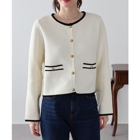 配色ラインのバイカラーデザインとフロントに並んだ金ボタンが、クラシカルな気品を放つカーディガン。
