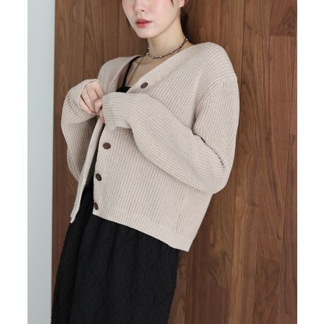 木目調ボタンがアクセントになるスラブニットカーディガン
