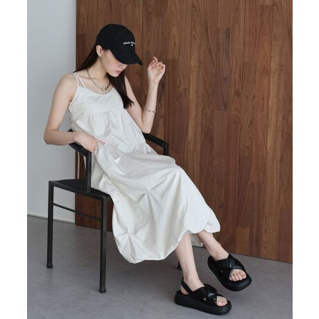 華奢なショルダーストラップが肩周りをスッキリと見せ、ボリュームのあるスカート部分との絶妙なバランスを実現。