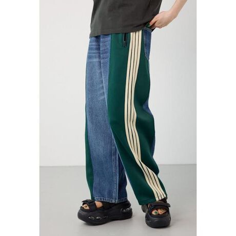 ■ポイント大人気のカスタムトラックデニムパンツに、新色が追加されて再登場。ジャージ×デニムの異素材バイカラーワイドパンツ。トラックパンツとデニムをリメイクした様なデザインがポイント。程よくワイドなシルエットで、ジャージ部分はウエストゴムなので、ストレスフリーで着用できるアイテムです。■ディテール主役級のアイテムなので、シンプルなトップスやグラフィックアイテムとの合わせがおすすめ。RODEO CROWNSオリジナルのタックボタンを使用し、バックポケットにピスネームを付けています。Lサイズはメンズも着用可能なサイズ感となっております。■スタイリング主役級のアイテムなので、シンプルなトップスやグラフィックアイテムとの合わせがおすすめ。■生地デニムは綿100%の10ozインディゴデニムを使用。デニムパーツにUSED加工を施し、脇にはジャージ素材をドッキングすることで、リメイクテイストに仕上げています。■透け感:なし■裏 地:なし■伸縮性:ややあり■光沢感:なし※お取り扱い上のご注意別布テープ部分に移染する可能性があります。製品の特長上、避ける事ができません。洗濯ネーム、アテンションに記載されている通りの管理をお願いします。[注意事項]※画像の商品はサンプルです。実際の商品と仕様、加工が若干異なる場合があります。※画像の商品は光の照射や角度、お使いのモニター環境により、実物と色味が異なる場合がございます。※着用、お取り扱いの際は、アテンションタグをご確認ください。