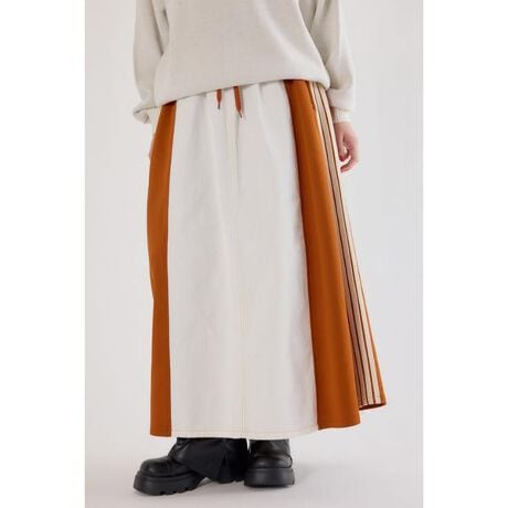 ■ポイント大人気なカスタムトラックDENIMに新型が登場。ジャージ×デニムの異素材バイカラースカート。歩くたびに揺れ動くフレアなデザインは、女性らしさを演出してくれます。ジャージ素材で程よく伸びる為、着心地抜群なスカートです。■ディテールデニム部分はUSED加工を施し、脇のジャージ素材とドッキングしたリメイクテイストの仕上がり。ウエストは周囲ゴムで楽ちんな仕様、脇にはニットテープのラインをあしらいました。後ろポケットにはピスネーム付きで、さりげないアクセントになっています。■スタイリング主役級のアイテムなので、シンプルなトップスやグラフィックアイテムとの合わせがおすすめです。■生地デニムは綿100% 10ozインディゴデニム使用。■透け感:なし■裏 地:なし■伸縮性:ややあり■光沢感:なし※お取り扱い上のご注意別布テープ部分に色移りする可能性があります。製品の特長上、避けることはできません。洗濯ネームやアテンションに記載されている取扱い方法に従って管理してください。[注意事項]※画像の商品はサンプルです。実際の商品と仕様、加工が若干異なる場合があります。※画像の商品は光の照射や角度、お使いのモニター環境により、実物と色味が異なる場合がございます。※着用、お取り扱いの際は、アテンションタグをご確認ください。
