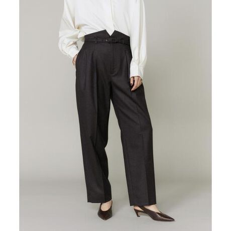 ■デザインやや丸みのあるフォルムが新鮮なハイウエストパンツ。カッティングでシルエットを出したパターンにこだわった一着です。中央には縦のラインを強調したセンタープレスを入れ、美しいシルエットの中にもきちんと感が見えるデザインに仕上げています。共生地のベルトもクラッシックな印象にしています。■素材バルベリス・カノニコは1663年より羊毛生産をはじめており、創業350年という圧倒的な歴史を誇る生地メーカーです。カノニコの生地は艷やかで発色がよく滑らかな肌触りのイタリアらしい生地で、多くの有名ブランドに採用されています。世界で最も売れている生地と言われるだけあり、カノニコを使用した生地は多くのセレクトショップやスーツショップで取り扱われています。・裏地あり・ポケットあり・共地ベルト付き■下げ札サイズ表記4=(13号)5=(15号)■サンプル撮影商品画像の商品はサンプルです。実際の商品とはサイズや色味、素材、デザイン等の仕様が若干変更になる場合がございます。■カラーについては、可能な限り実際の商品に近いカラーで撮影をおこなっておりますが、照明の関係により実際の製品とは色味が違って見える場合があります。またパソコン・スマートフォンなどの環境により、若干製品と画像のカラーが異なる場合もございます。現物と画像のカラー差異については返品理由となりませんので、予めご了承ください。■サイズ表記はあくまで目安となります。