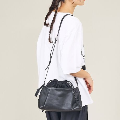 実用ポイント:巾着を浅めに絞るとレザーのラインがより美しく見えるため、見せ方で表情を調整して楽しんでください。