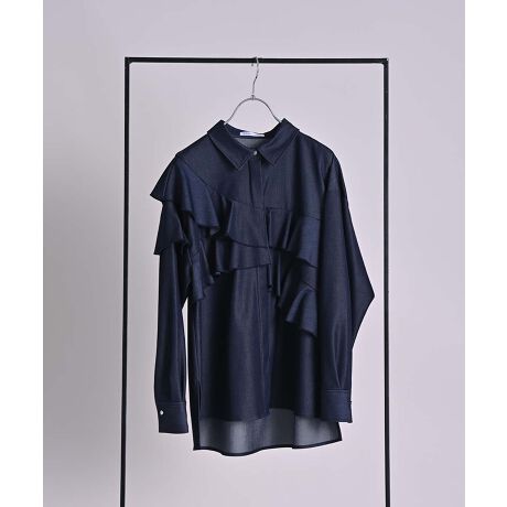 シワになりにくく、落ち感のきれいなポリエステルレーヨンのデニムライク素材を使用したフリルシャツ。
