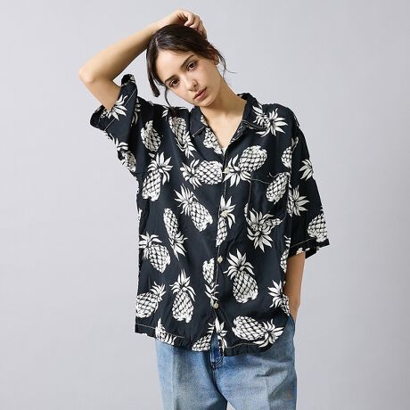 滑らかな落ち感と、肌離れの良さが魅力のレーヨン素材を使用したアロハシャツ。