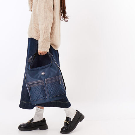 ワンハンドルで肩掛け、左右にショルダーベルトを引っ張るとリュックとしても使える優れもの。