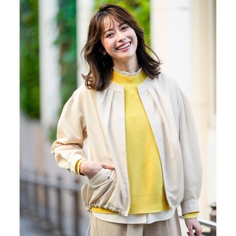 ・襟元と袖のタックデザインが華やかで女性らしいブルゾン・きれいめな印象に仕上がるノーカラーで通勤スタイルにもマッチ・ファスナーなどにさりげなくちりばめられたゴールドカラーがポイントに・裾のゴムストッパーを調整することで、お好みのシルエットに変更可能・袖にはタックを入れることで、さりげなくバルーンシルエットにしています