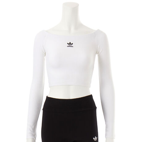 スタイルと快適さを融合させたエッセンシャルズ リブ オフショルダー 長袖Tシャツ。