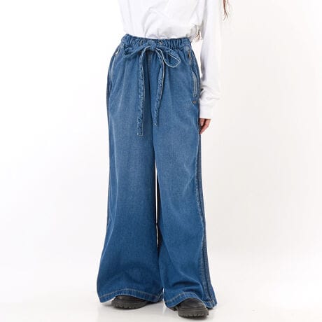 adidas Originalsコレクションのデニムトラックパンツ。現代的なミニマリズムが際立つデザインで、フォーマルスタイルに心地よさをプラス。