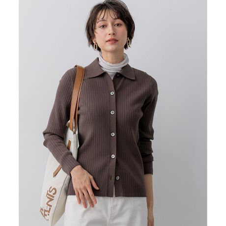 縦長効果ですっきりと見せる、モダンなデザインのポロカーディガンです。ワイドリブが特徴で、羽織りとしてはもちろん、全てのボタンを閉めればプルオーバーのように一枚着としてもお楽しみいただけます。裾のボタンをいくつか開けることで、ワイドパンツやボリュームスカートなどともバランスが良く、様々なボトムスと合わせてシルエットの変化を楽しめます。着こなしの幅が広がる、一枚で何通りもの表情を見せるアイテムです。カラーは、シックな印象のブラック(#005)、上品で柔らかなベージュ(#033)、深みのある落ち着いたダークブラウン(#035)の3色をご用意いたしました。