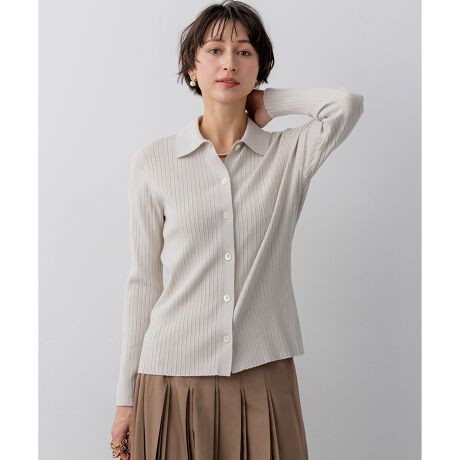 縦長効果ですっきりと見せる、モダンなデザインのポロカーディガンです。ワイドリブが特徴で、羽織りとしてはもちろん、全てのボタンを閉めればプルオーバーのように一枚着としてもお楽しみいただけます。裾のボタンをいくつか開けることで、ワイドパンツやボリュームスカートなどともバランスが良く、様々なボトムスと合わせてシルエットの変化を楽しめます。着こなしの幅が広がる、一枚で何通りもの表情を見せるアイテムです。カラーは、シックな印象のブラック(#005)、上品で柔らかなベージュ(#033)、深みのある落ち着いたダークブラウン(#035)の3色をご用意いたしました。