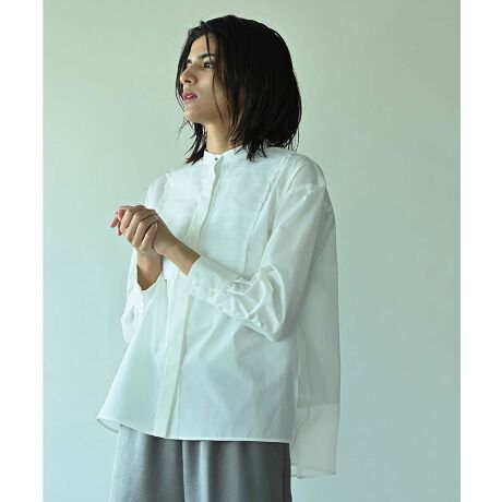 シワになりにくいポリエステルコットンのブロード生地に、シアー素材のプリーツパーツを重ねたブラウス。
