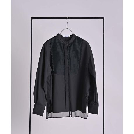 シワになりにくいポリエステルコットンのブロード生地に、シアー素材のプリーツパーツを重ねたブラウス。