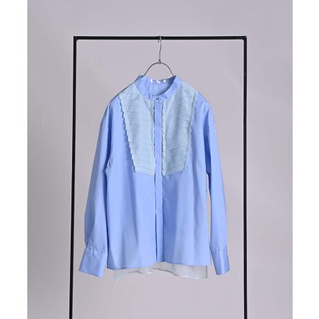 シワになりにくいポリエステルコットンのブロード生地に、シアー素材のプリーツパーツを重ねたブラウス。