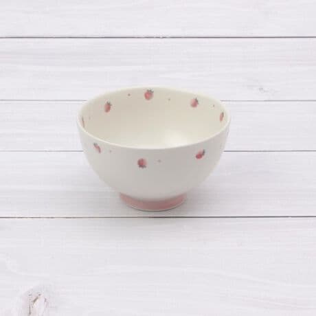 かわいい小さな苺を銅板転写を素焼きに一つ一つカットし、貼りつけてアイボリーの釉をかけて焼成した食器です。