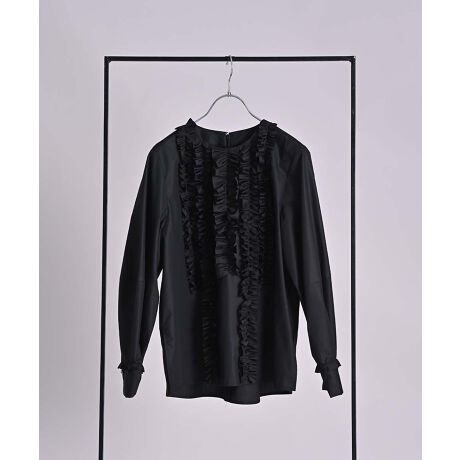 シワになりにくくハリ感のあるポリエステルコットンタイプライターに、モードな印象のキュプラフリルを重ねたデザインブラウス。