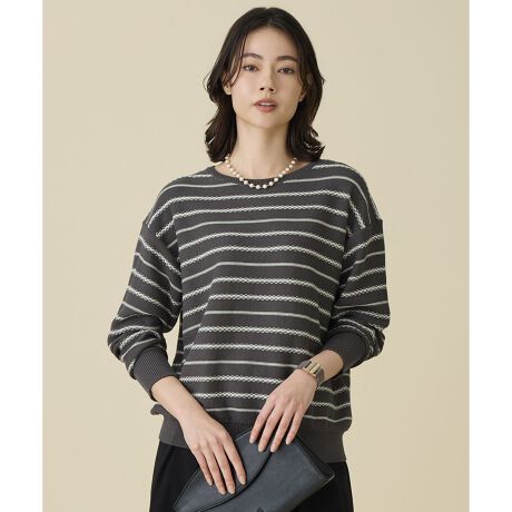 アウターINでも着映えるボーダーニット■デザイン程よいふくらみとウォーム感を備えたバルキーニットです。自由区らしい繊細で華やかな印象を演出するランダムボーダーは、異なる編み組織を用いて立体的に表現しています。軽やかな着心地で、お出かけや通勤スタイルにもおすすめです。■素材ポリエステルを芯糸とし、綿原料で包み込みながら編み上げたリリヤーンです。ポリエステル芯が糸の構造をしっかり支えることで、ふんわりとした膨らみを保ちつつ、糸本来の表情感を損なわずに仕上がっています。軽やかでありながら豊かなボリューム感があり、たっぷり空気を含んだソフトタッチが特徴の素材です。