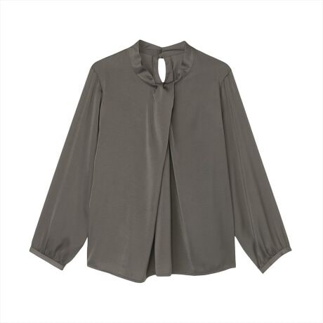 無地の落ち着いた色合いに光沢ある生地感の組合せが洒落感漂うブラウス。