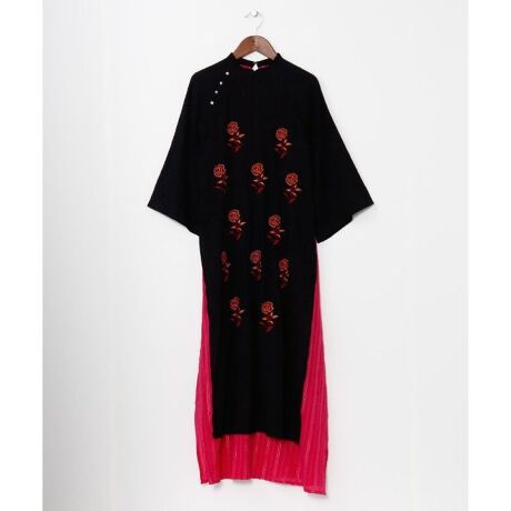 [型番:IAC-6111-2026]花鳥風月を思わせる薔薇刺しゅうをあしらったジャカード素材のワンピース。ベトナムの民族衣装アオザイ調シルエットとバイカラー使いが調和する、一着で映える存在感。