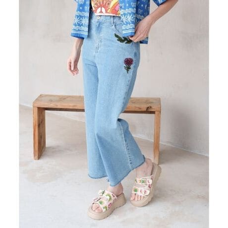 [型番:NSR-6101-2026]ウエスタンブーツとカラベラ刺しゅうが目を惹く細身のベルボトムパンツ。ヒッピースタイルに映えるデニムアイテム。