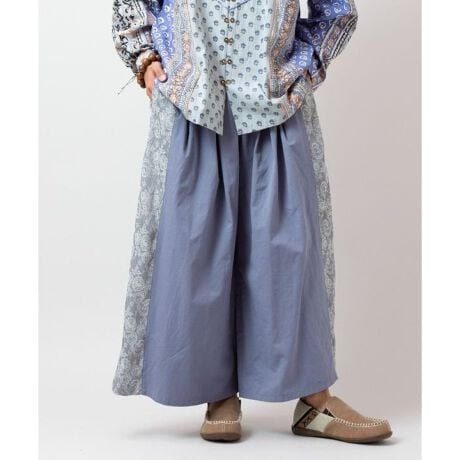 [型番:CAA-6104-2026]モン族から着想を得た異素材切替のパンツ。花柄ジャカード生地とワイドシルエットが個性を引き立てるデザイン。