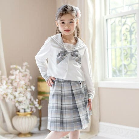 セーラージャケット、チェックスカート、リボンブローチ